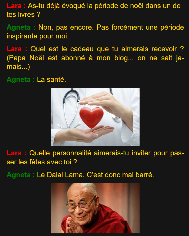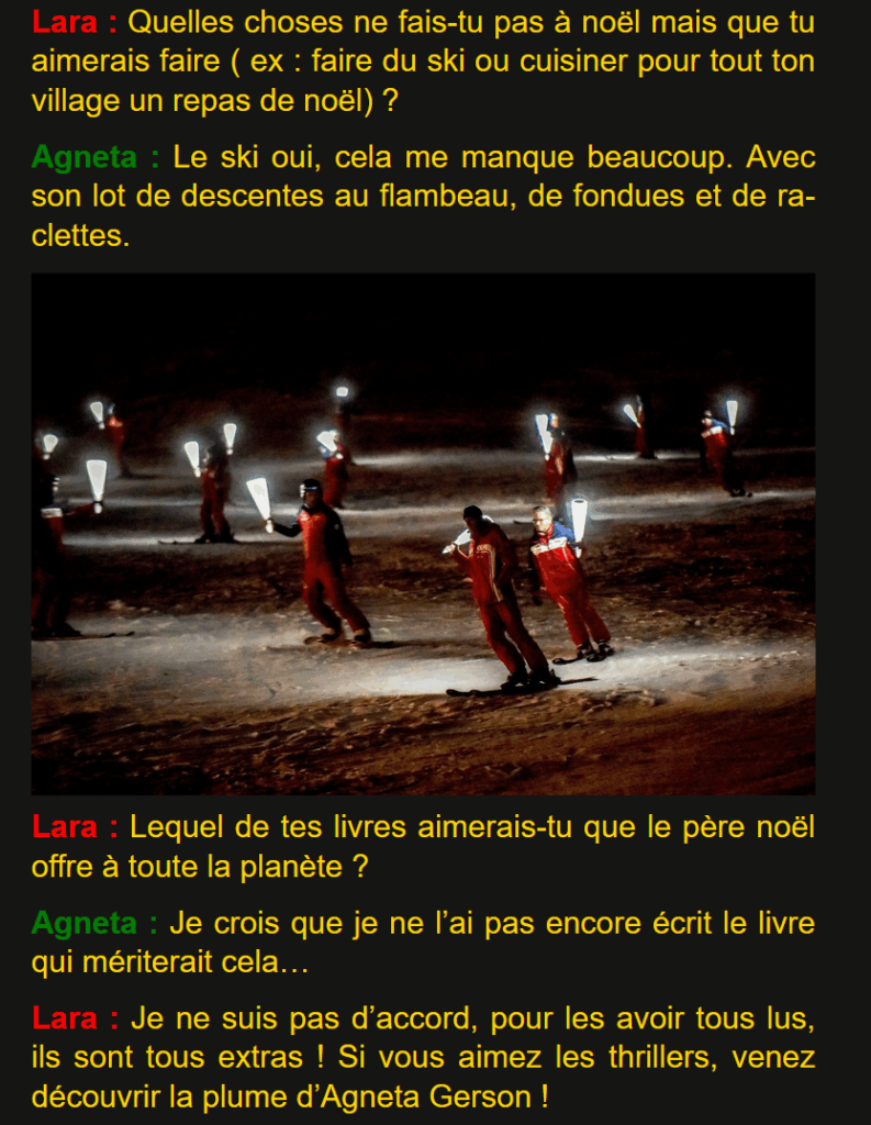 Noël 2023 novembre 19, 2025novembre 19, 2025| agnetagersonagnetagerson| 0 Comment | 5:52 pm Categories: Interviews Merci à Laraleelouka pour cette interview sur son blog de chroniques littéraires ! Leave a ReplyVous devez vous connecter pour publier un commentaire. Navigation de l’article PREVIOUS Previous post: 2025 : Mordus de thrillersNEXT Next post: Chronique de « La mort en cadeau », thriller scientifique et politique Related Post 2025 : Mordus de thrillers2025 : Mordus de thrillers novembre 14, 2025novembre 14, 2025| agnetagersonagnetagerson| 0 Comments | 6:31 pm Merci aux mordus de thrillers pour cette interview ! Bonjour Agneta, présentez-vous aux mordus : Je suis une ingénieur en télédétection spatiale, j’ai entre autres travaillé dans un laboratoire d’océanographie Read MoreRead More